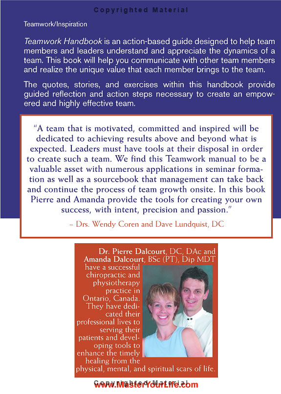 Dr. Pierre and Amanda Dalcourt are healthcare professionals utilizing the holistic approach to healing. They have created their Master Your Life series blending inspirational quotes with educational resources and written activities that encourage people to attain total health by healing the mind, body and spirit. Readers using the Healing Handbook can improve their health by identifying their healing needs and actively tapping into their inner resources to mend the scars of the mind, body and spirit. This useful guide can be helpful in the healing process by giving the person's inner healer a chance to work.