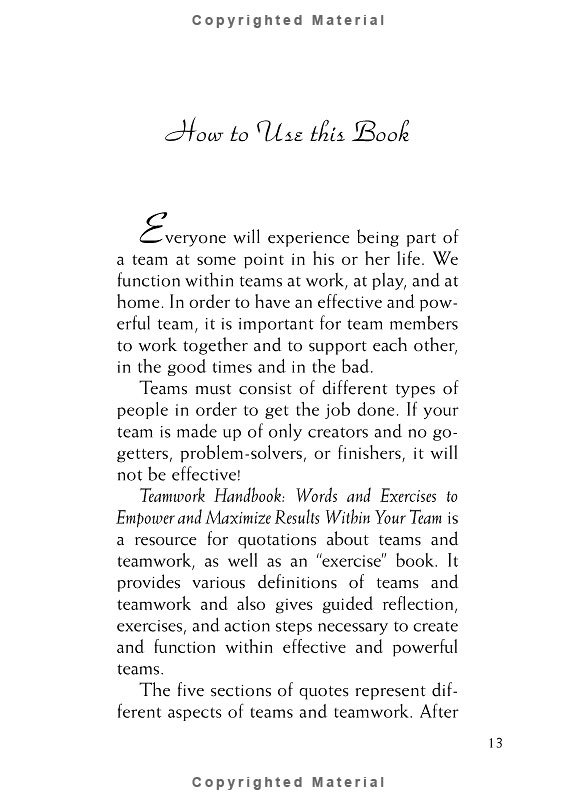 Although I read this book without being part of any workshop, it has given me the tools required to build a successful, profitable team around me. This is also the first book ever read that has inspired me to become a more complete and better person. I recommend this Teamwork Handbook for every organization, as well as an empowering book for one to enjoy.